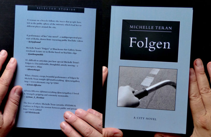 Folgen, a 50-minute lecture performance, draws on the existing narratives of video makers found on YouTube to build a multi-layered media landscape of Berlin. Teran’s subjective approach, which weaves together mapping, literature and live performance, combines fragments of images and sound from YouTube videos with her own narration, using the traces video makers have left in the public sphere of the internet to follow people throughout the city. Through this process, the city becomes a place to be inhabited and experienced through an other’s narrative, stepping into somebody else’s shoes. The performance is a deliberate mixing between reality and fiction, an interweaving narrative about desire. The many protagonists involved in the making of the work create the stories told during the performance.