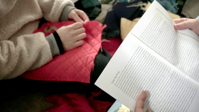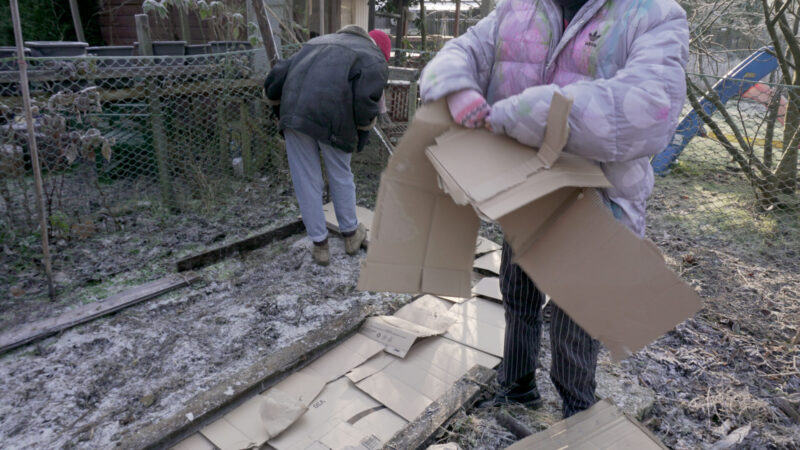 Ingredients: Used cardboard, rotting organic matter, dead and decaying plants, fallen branches, soil, a text about shit and modernity’s relation to death and decay, one of the coldest and darkest days during the year, ice, intense cold, smoke, fire, a warm hut, cookies, empanadas, cornbread, hot tea, fabric scraps, multi-coloured thread