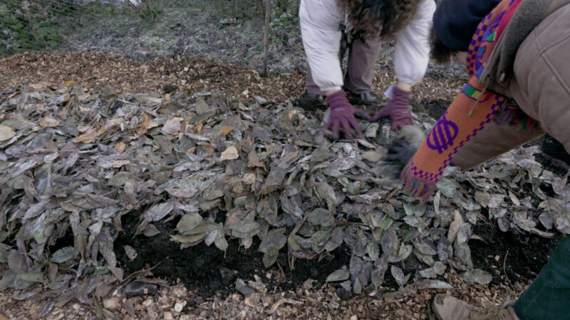 Gather desiccated leaves around the garden and garden entrance, the slimy remains of artichoke leaves from one of the other garden beds