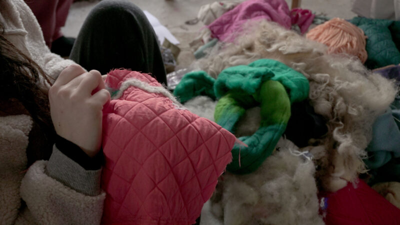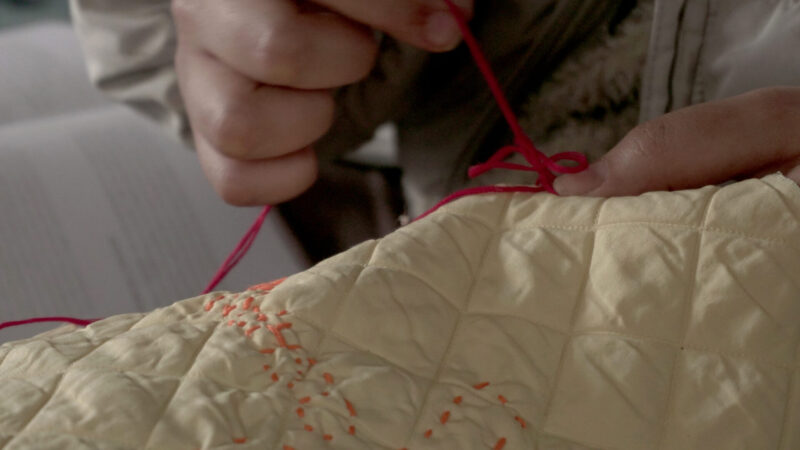 Stitch the quilt together using used fabric scraps and multi-coloured thread