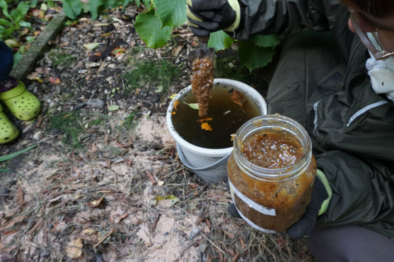 Ingredients: garlic and nettle ferment, bran, coffee grounds, dried leaves, compost, worm castings, sea water, rain water, brown rice vinegar, indigenous microorganisms raw sugar mixture, hay foraged from the canal shore