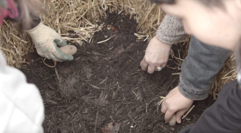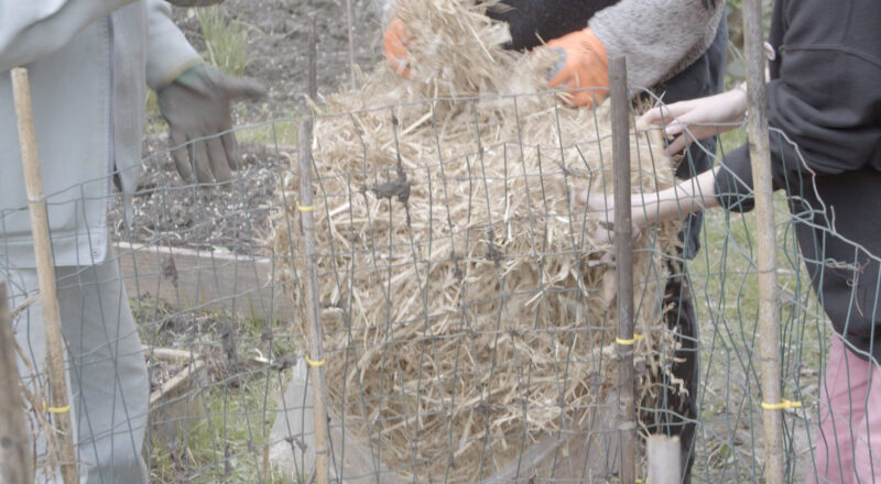 Ingredients: decomposed nettle buried last October, ceramic pot, straw, mud, compost, used fence wire, bamboo posts, winter water, potatoes, a yellow plum tree in full bloom, wild garlic freshly harvested, a savoury meal made from last year’s harvest, a text on embodied activism, clouds, rain drizzle, intermittent sunshine, a swarm of bees, a breathing practice for metabolising vibration with the awakening hive