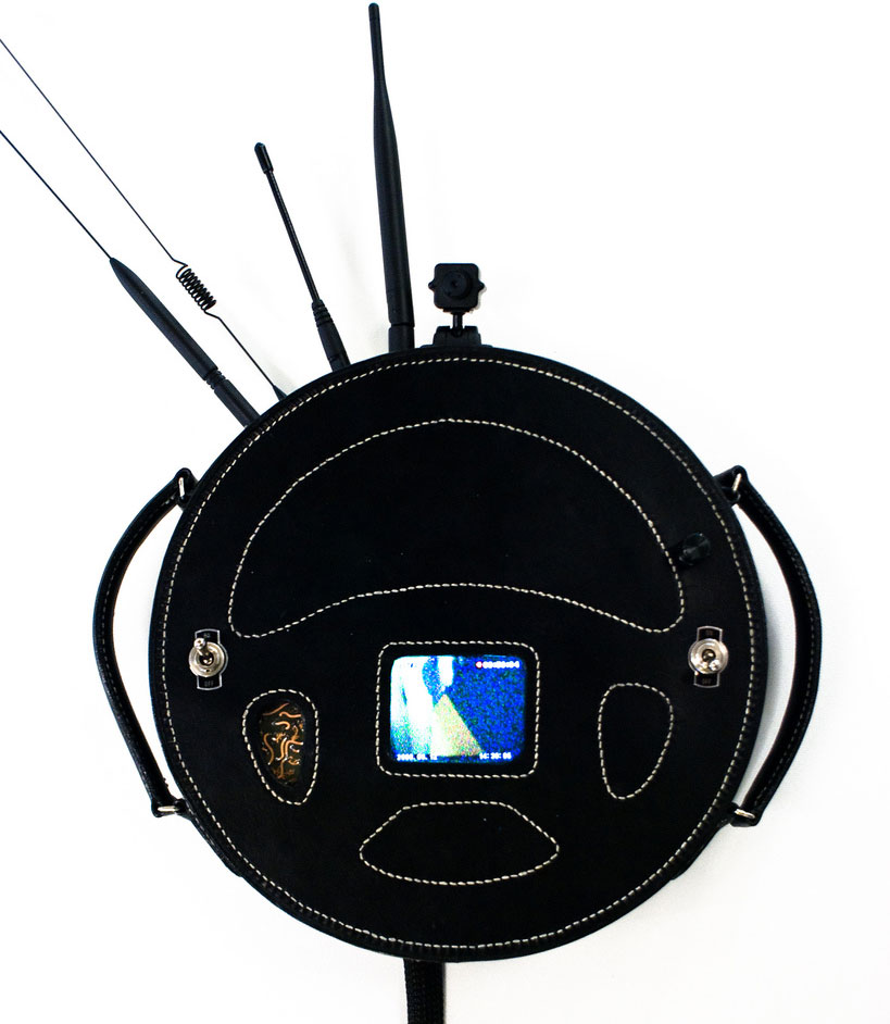 Materials: custom electronics, recordable monitor, hand-stitched leather, video receiver, antenna